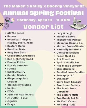 Come shop 35+ vendors hosted by the Maker's Valley. Live music by The Ricky Olaguer Full Band, tasty eats from multiple food trucks, and sip on delicious wine . Open to all ages, come enjoy face painting, photo booth, and lawn games. Food: B'More Taqueria Deli-ish Jimmy's Famous Seafood Libb's Grill Local Oyster Smoke Point …